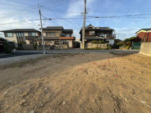 地縄とは、家や建物を建てる前に、設計図面通りに建物の位置・大きさ・配置などを地面に縄やロープで示す作業のことです。図面と実際の建物配置を確認することで、隣地とのトラブルを防いだり、敷地の状況に合わせて問題点を洗い出したりします。