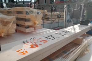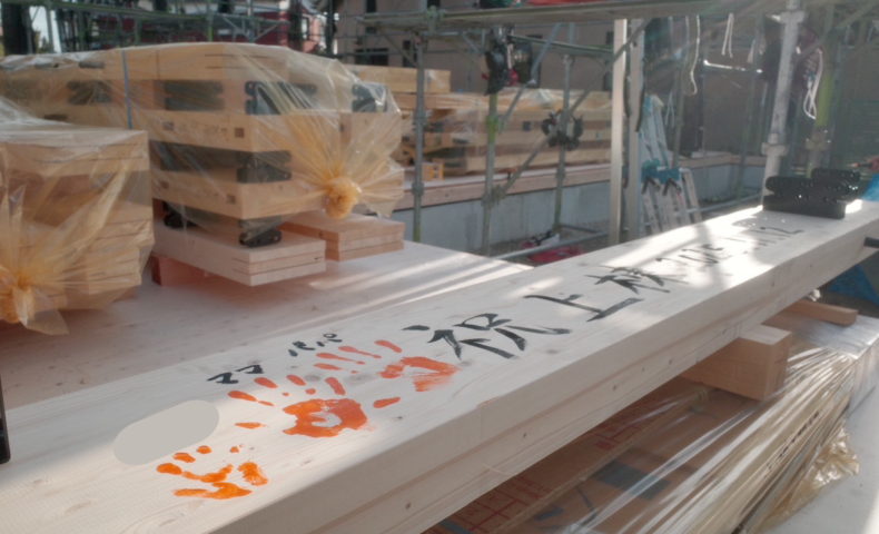 写真のように、真新しい梁にご家族の手形と文字を書いていただき、世界に一つだけの“家づくりの思い出”が刻まれました。
