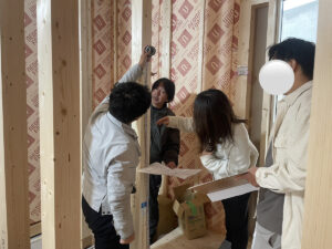 写真のように実際にメジャーを当てたり、壁の位置を示したりしながら、「棚の高さはこのくらいが使いやすそうですね」などと、現場でしかできない細やかな調整も行いました。
