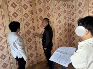当日は現場監督と営業、電気周りの確認は電気屋さん、下地や棚の位置は大工さんと一緒に1つ1つ丁寧に話し合いながら進めていきました。