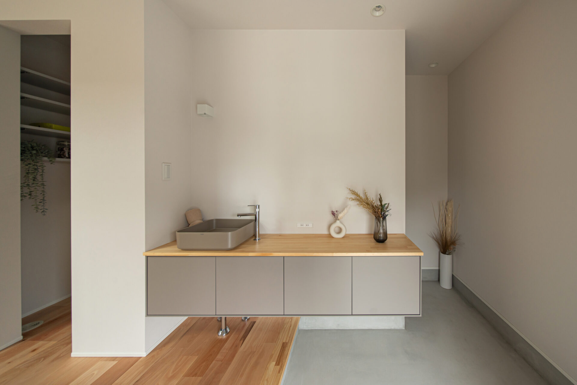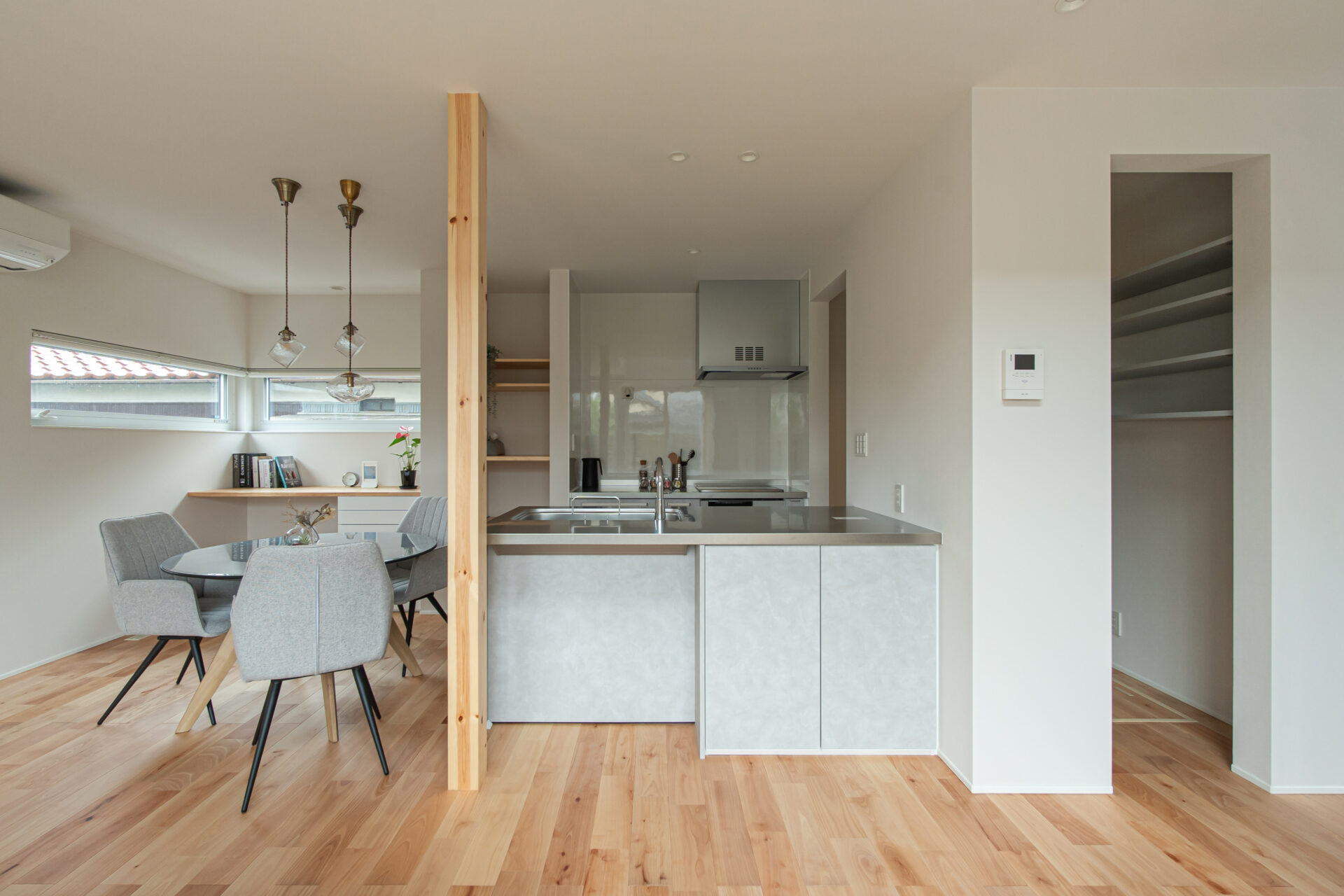 キッチンはシンクとコンロが分かれた2列型タイプを採用。コンロが壁側にあるため、シンク側がすっきりと見える。