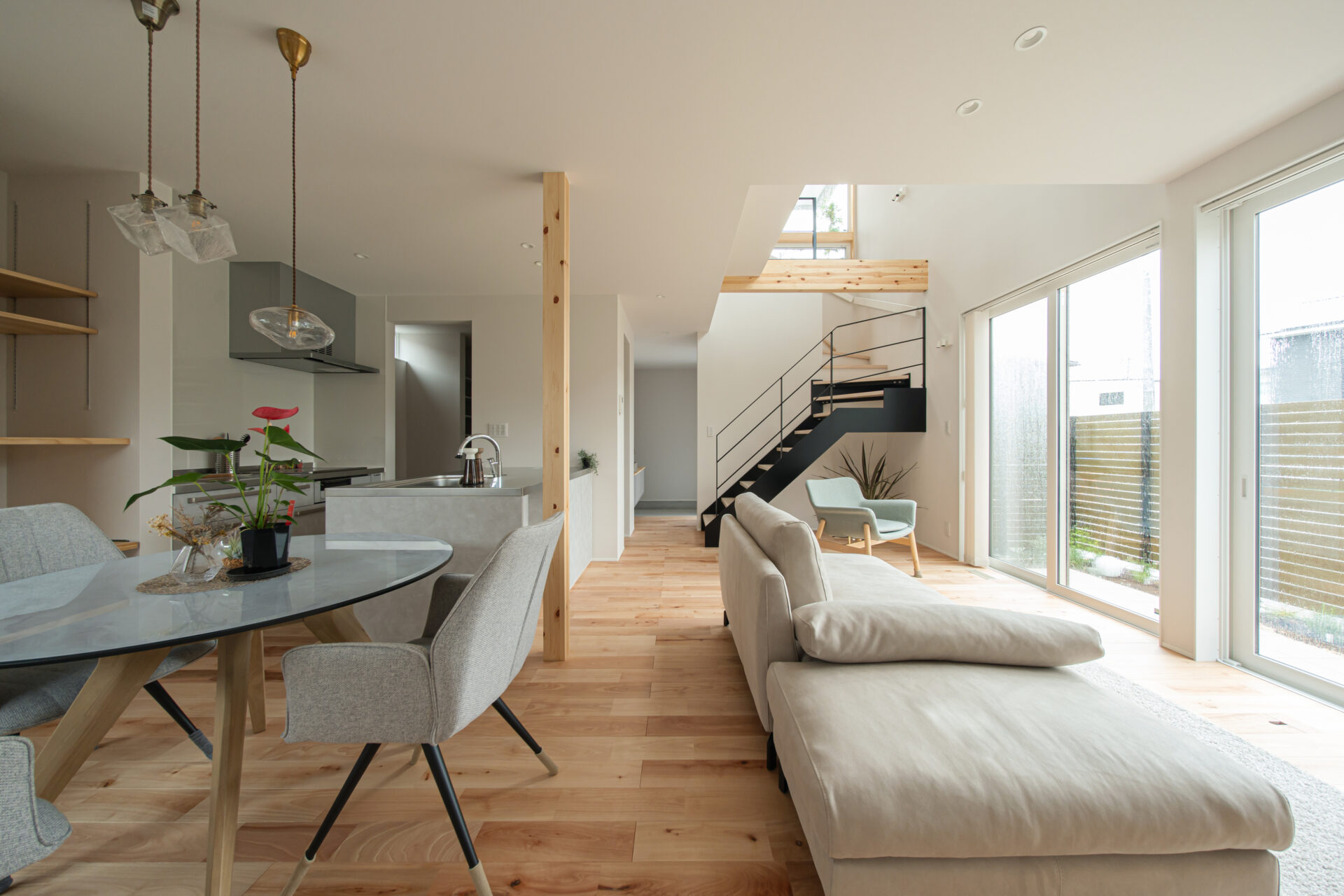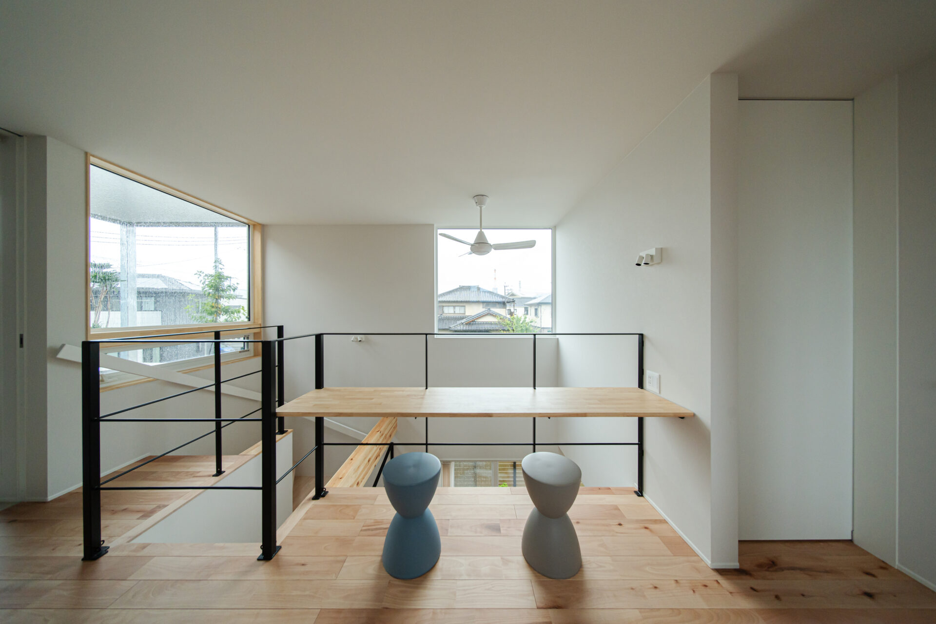 外観の抜け感・近隣の家・光の入り方を考慮してあえて2階北東にバルコニーを配置。入り口から一直線に目に入るバルコニーはこの住まいの顔でもあり、室内に光を導く場所でもある。