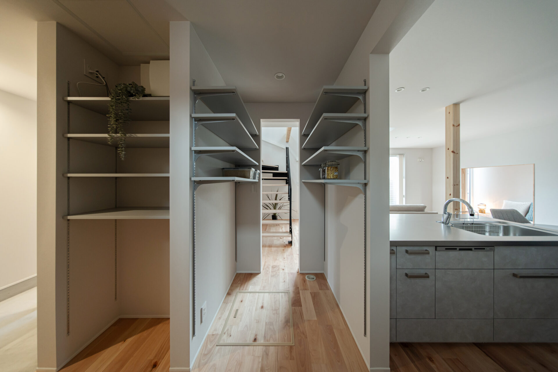 「玄関→シューズクローゼット→パントリー→キッチン」の動線のため、帰宅してすぐに買ってきた荷物を下ろすことができる。