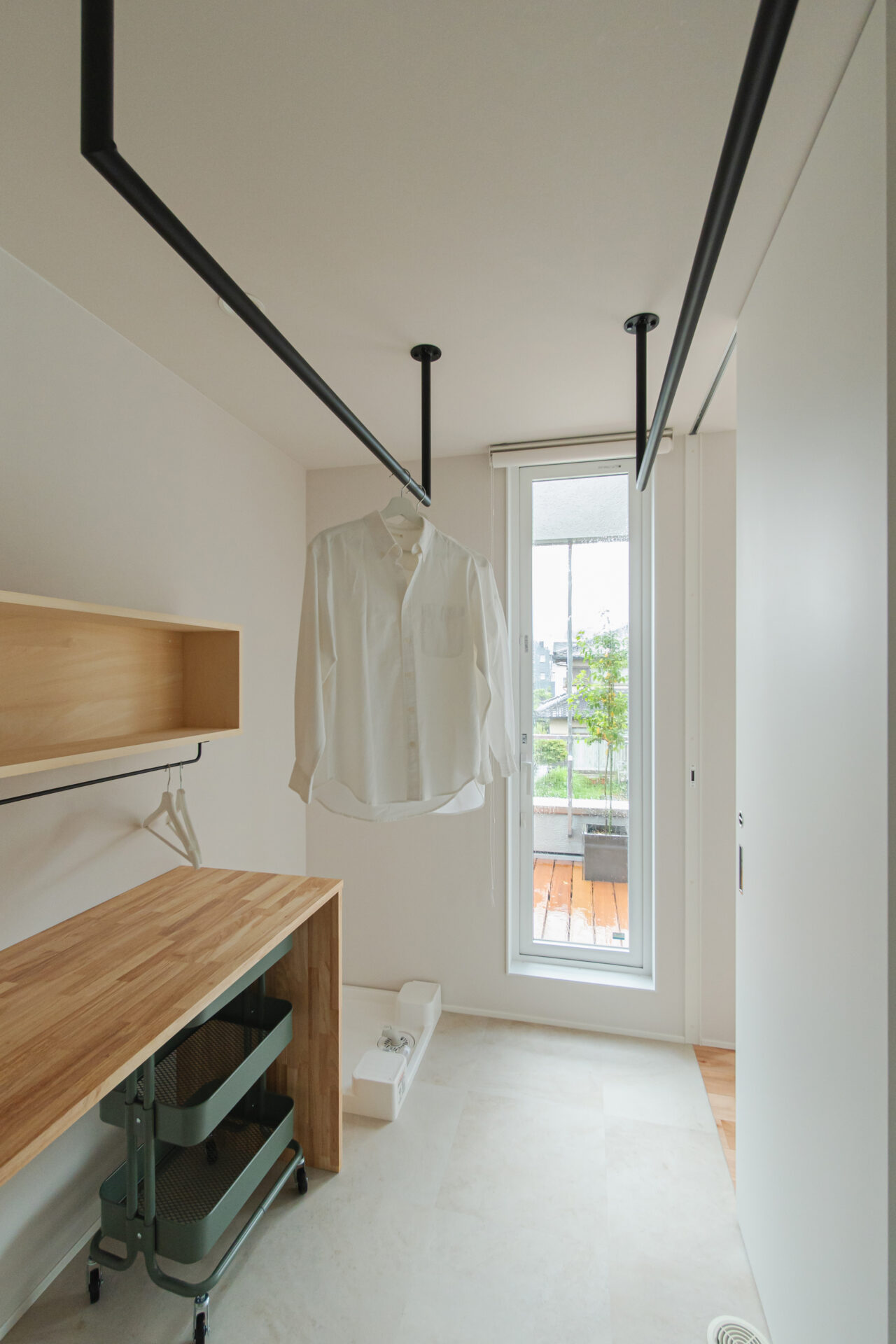 ファミリークローゼットのすぐ横にはランドリー室。奥にはテラスが見える。