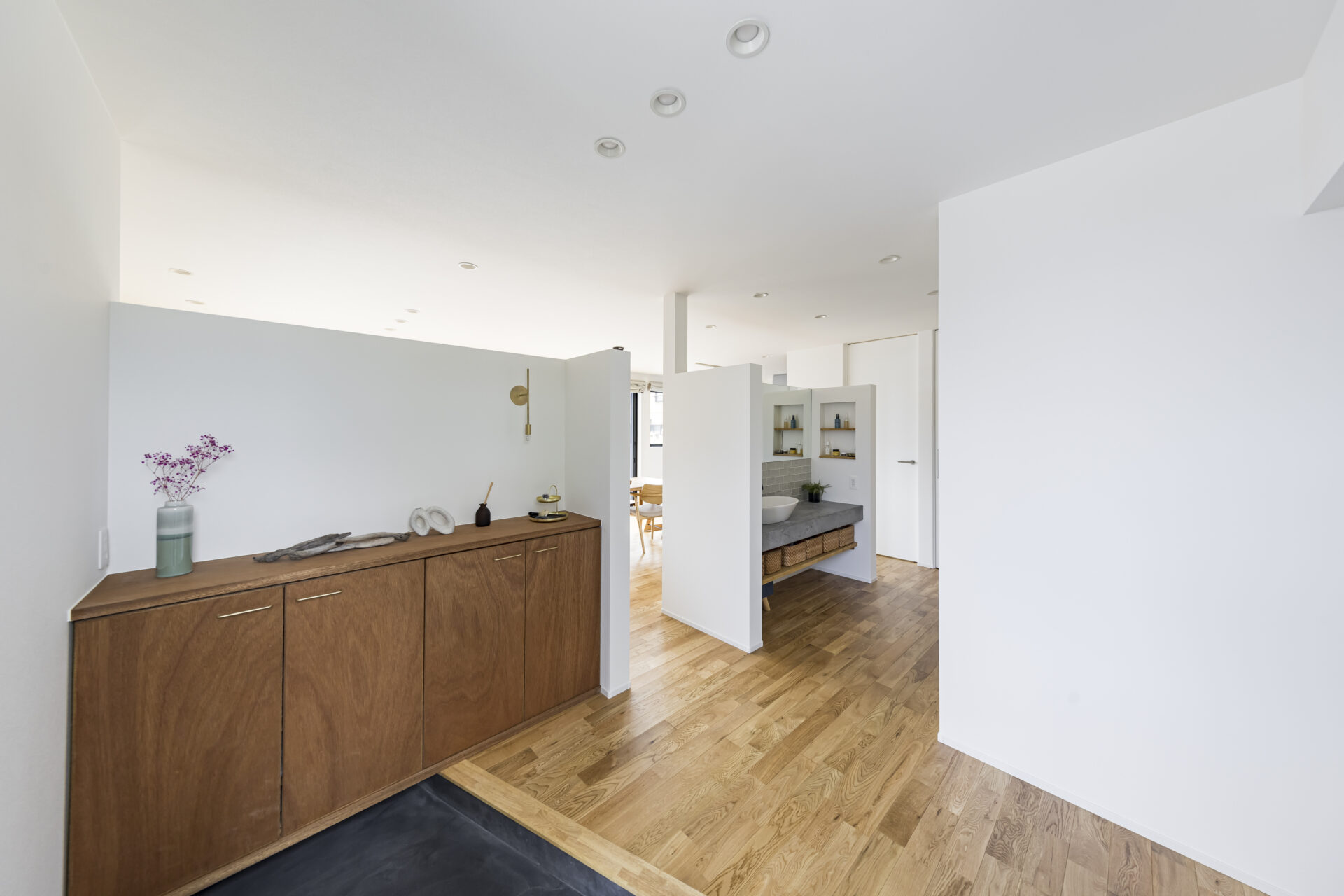 玄関収納は、黒モルタルの床と抜群の相性。 ホールを左に進むとLDKが広がり、右側はプライベートな空間へと続きます。