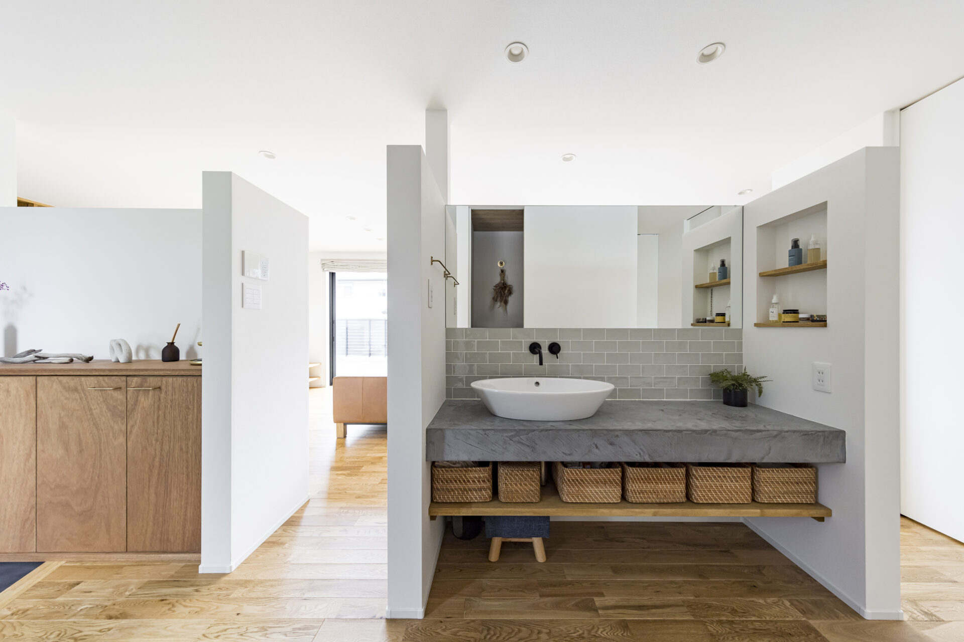 玄関を入ってすぐにある手洗いコーナー。 帰宅してすぐ手を洗うことができます。 横長のカウンターはモールテックスで仕上げられ、ワイドな鏡が空間の広がりを引き立てています。 上部はリビングとつながっている。