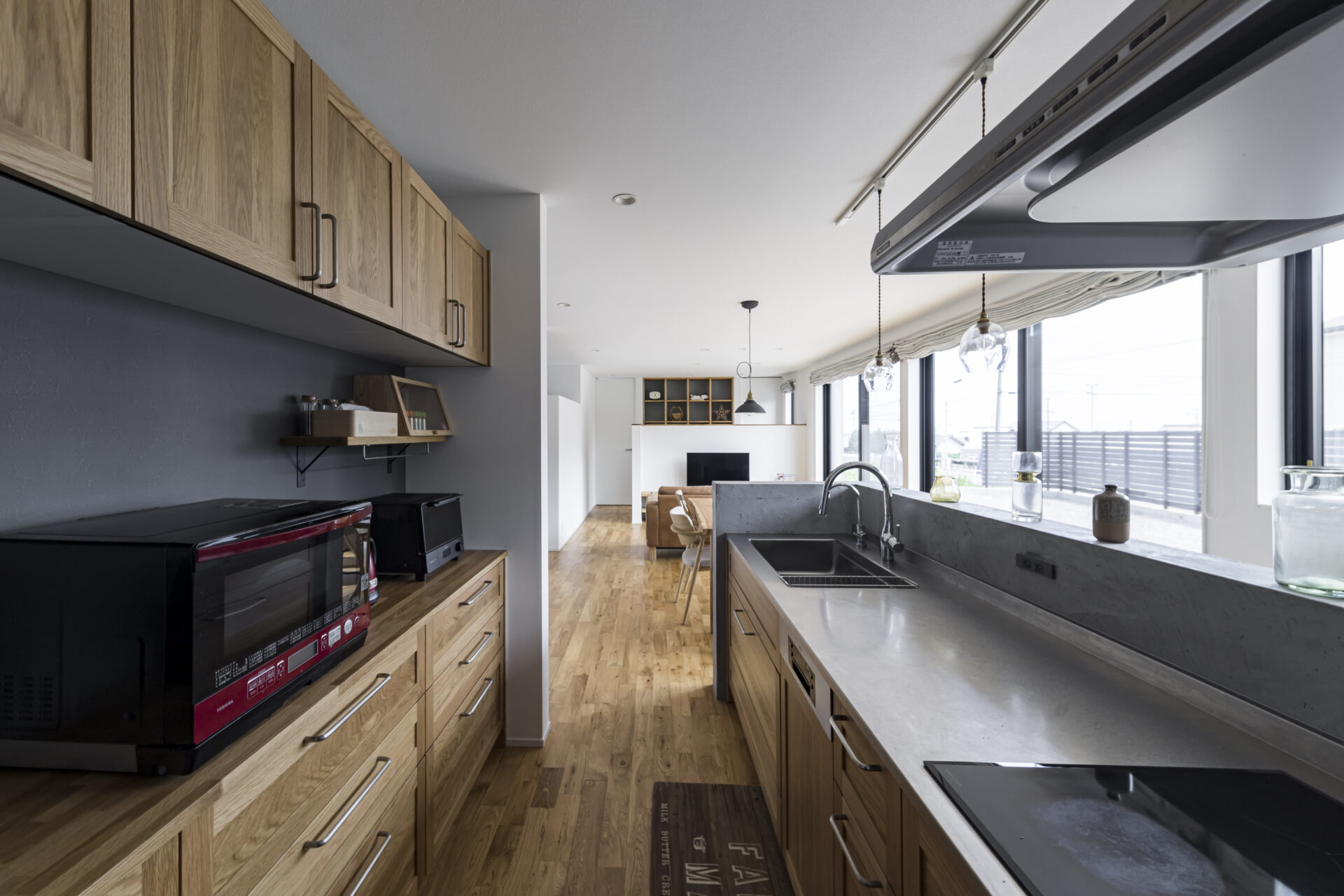 回遊性を確保するため、キッチンはダイニングと横並びに。 木製の扉は奥様のお気に入りの一つです。
