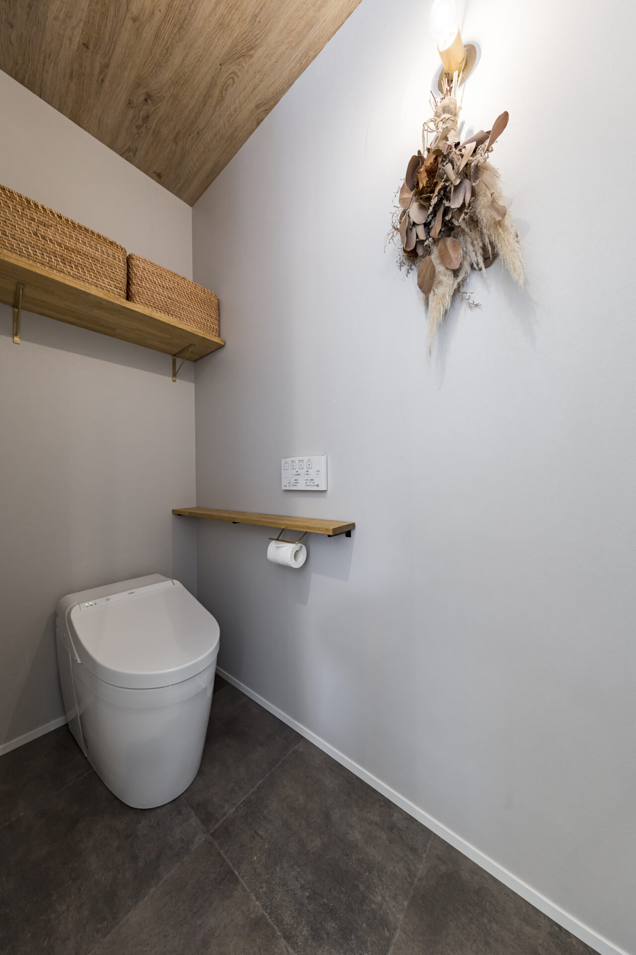 全体をグレーと木の質感でまとめ、まるでカフェのような印象に。 壁面にはドライフラワーのスワッグが飾られ、自然素材のアクセントが心地よい癒しを演出しています。