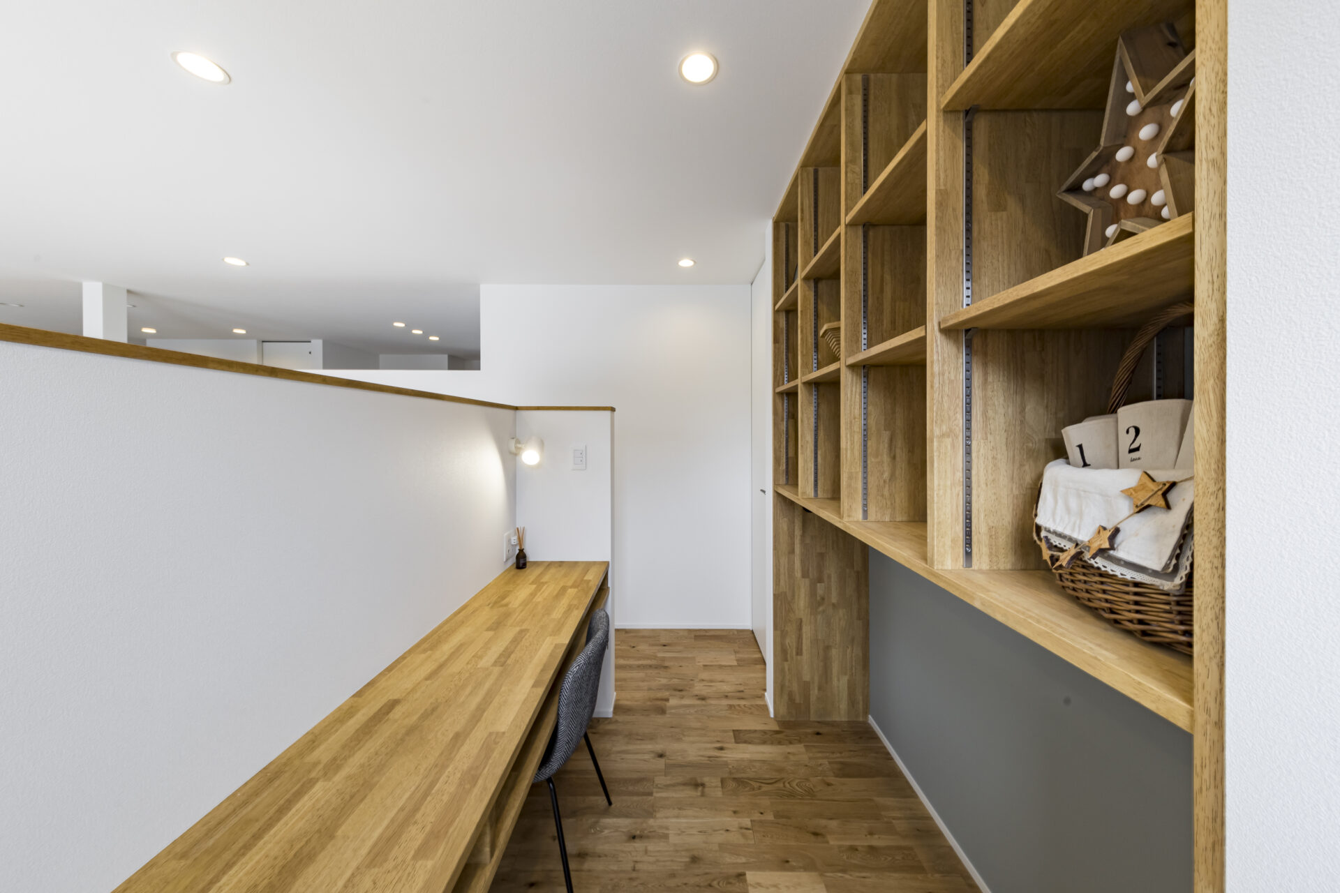 スタディコーナーには造作の収納棚。 お子様の荷物をスッキリ片付けることができます。