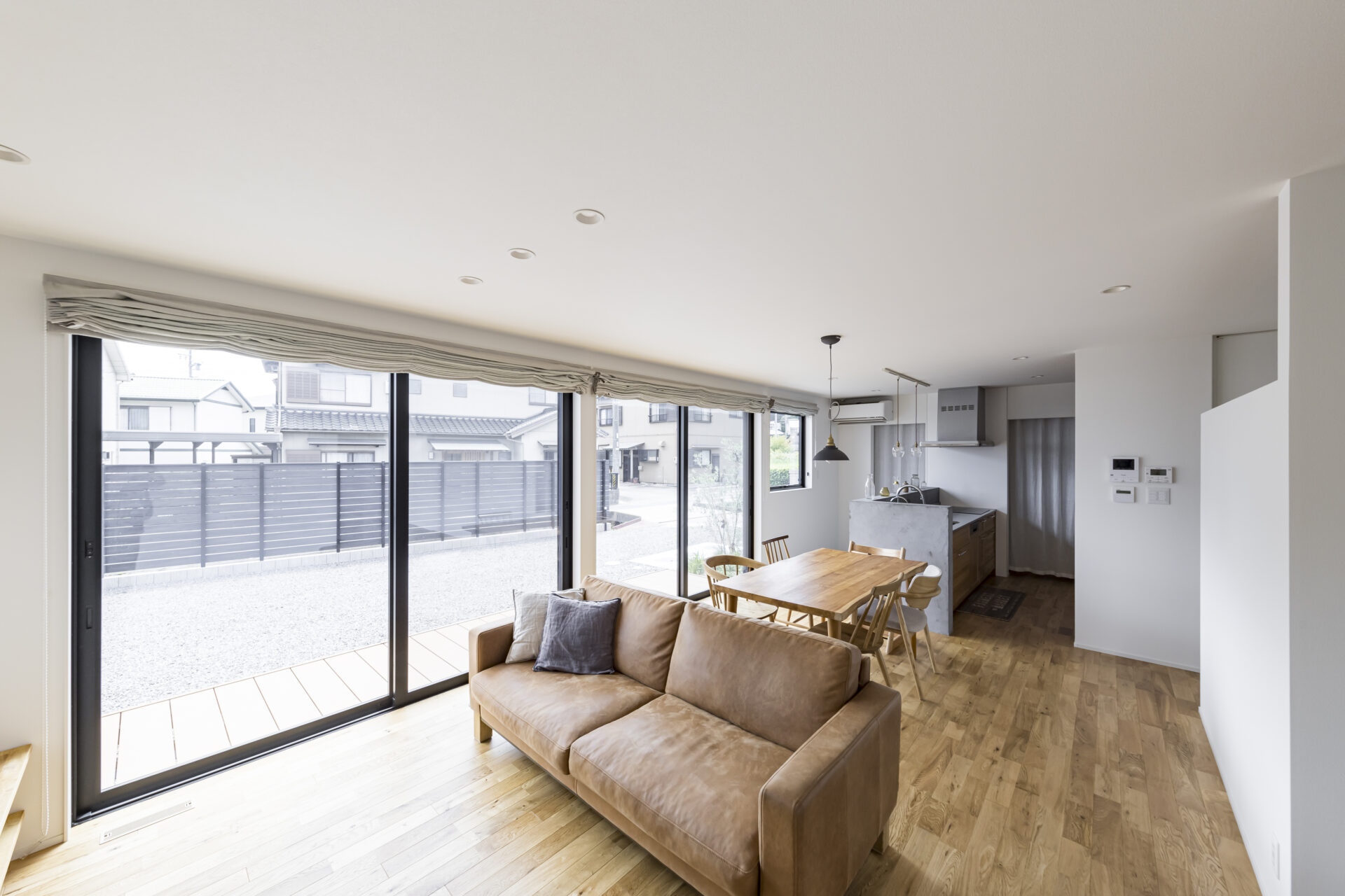 大きな掃き出し窓から豊かな光が室内に差し込み、開放的なLDK。 ウッドデッキがリビングとつながり、内と外の空間を自然に一体化。 右手の白い壁の向こうには、玄関から続く手洗いコーナーがあり、浴室やクローゼットなどへの動線もスムーズに。
