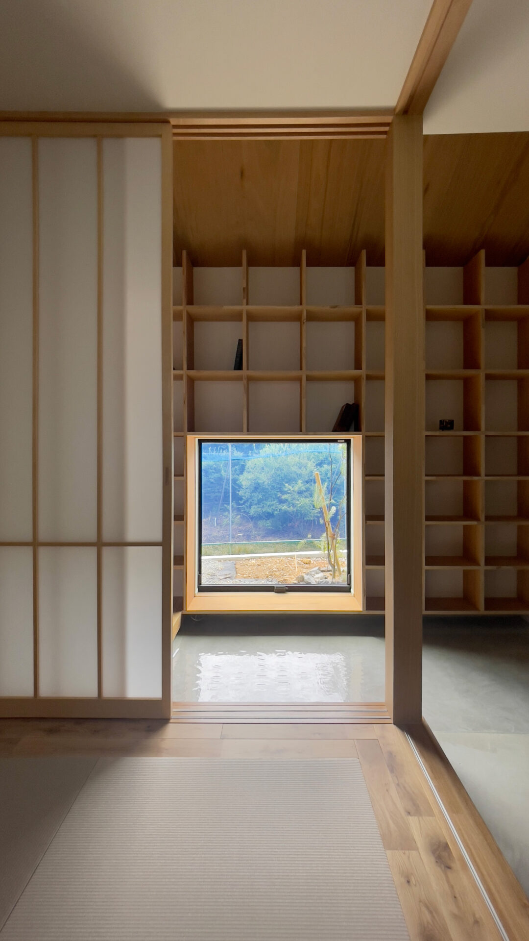 個室には景色を切り取るピクチャーウィンドウがあり、日々の生活に癒しを与えます。 玄関土間と一体になる和室は、土間越しの地窓から採光を取っています。 障子を閉めれば客間にもなります。 玄関も広く見え、個室にもなる便利な部屋です。