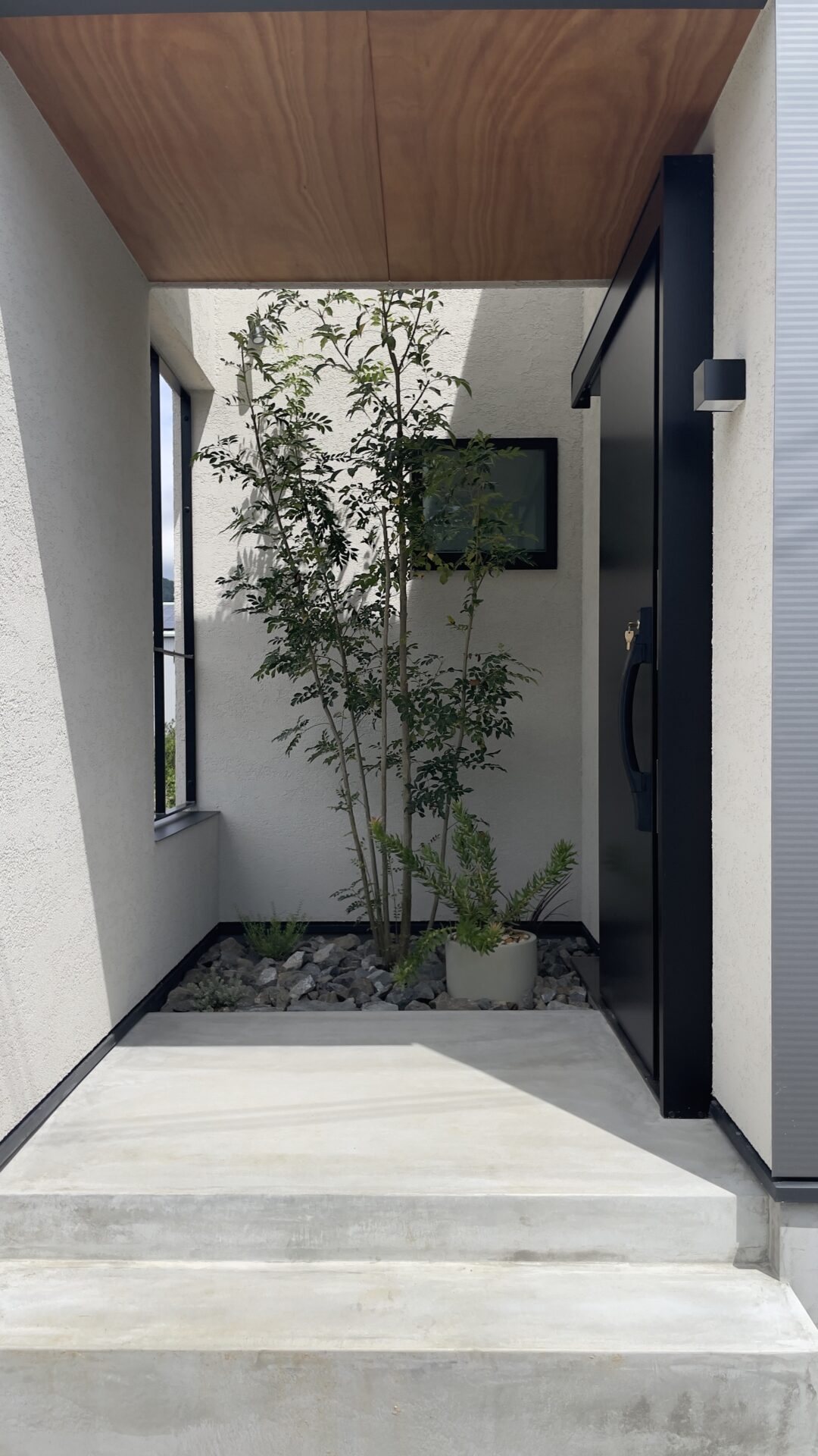 アイアン格子越しに眺められる坪庭には、シマトネリコと地被植物が楽しめます。