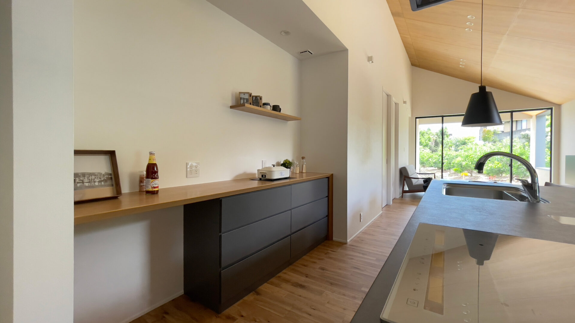 玄関からリビングまで続く造作本棚。 本や雑貨など、お気に入りのアイテムを自由にディスプレイできます。 日々のストレスからの解放、膨大な書籍の収納と音楽を楽しめる場所、『人間力の回復』というキーワードを基に大好きな本に囲まれ図書館のように穏やかな時間が流れる場所を目指しました。 南面から入ってくる木漏れ日のような光は、それぞれの場所に適度な明るさと視線の抜けを確保しています。 キッチン前はスタディカウンター、座って正面の窓からもミカン畑が広がります。