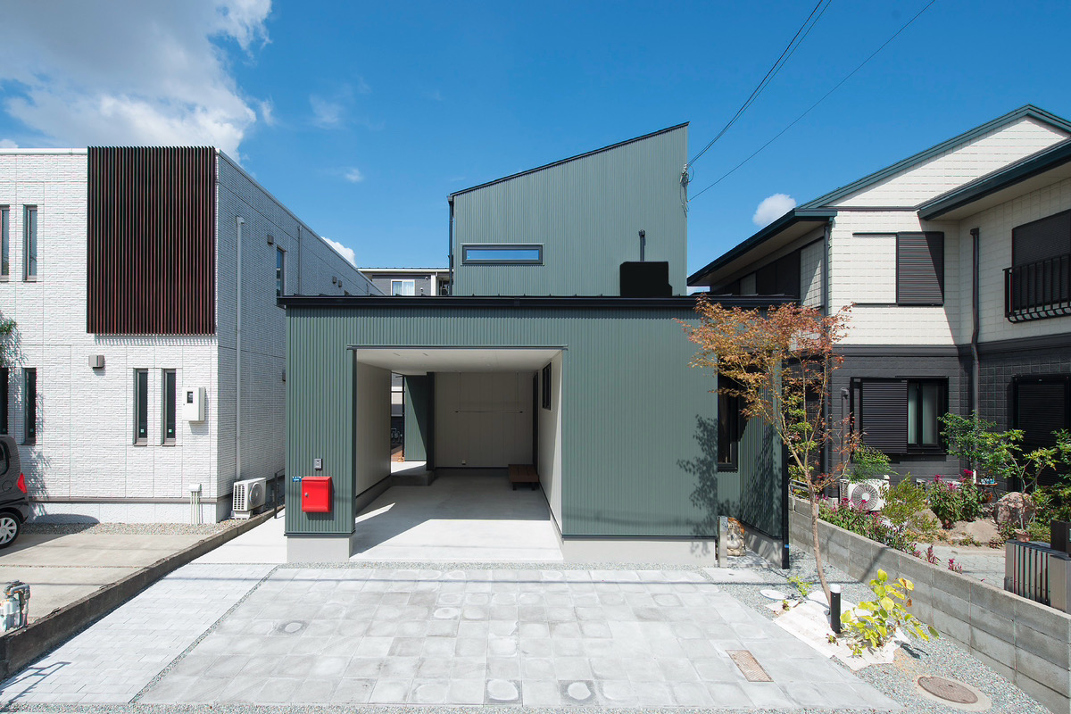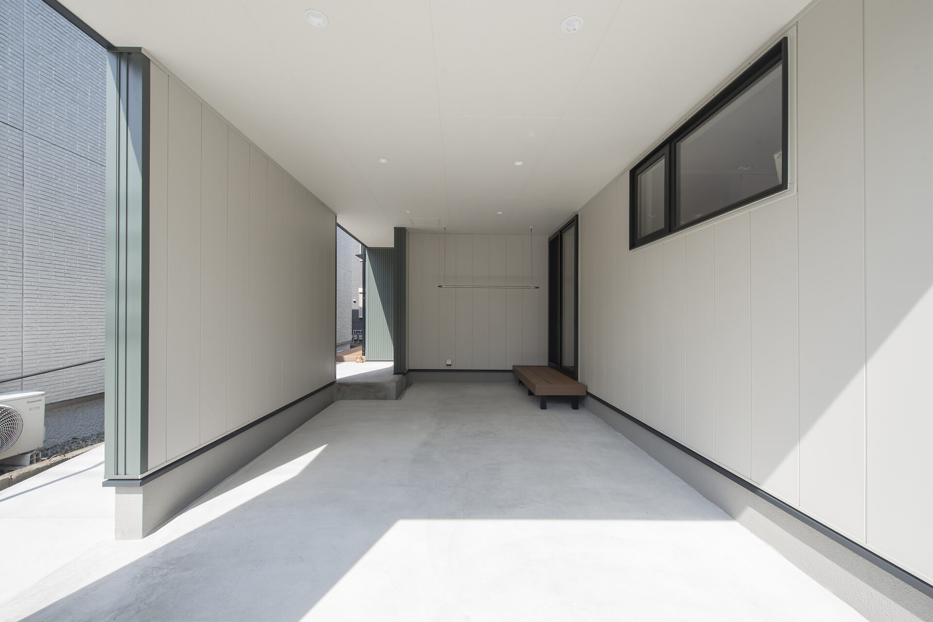 ヒアリングの中でご主人の夢を建築家が汲み取り実現したピロティ。 現在はガレージとして、将来は店舗として活用予定。 地域のコミュニティの場としても機能できるよう開きつつ、プライバシーも両立した空間です。