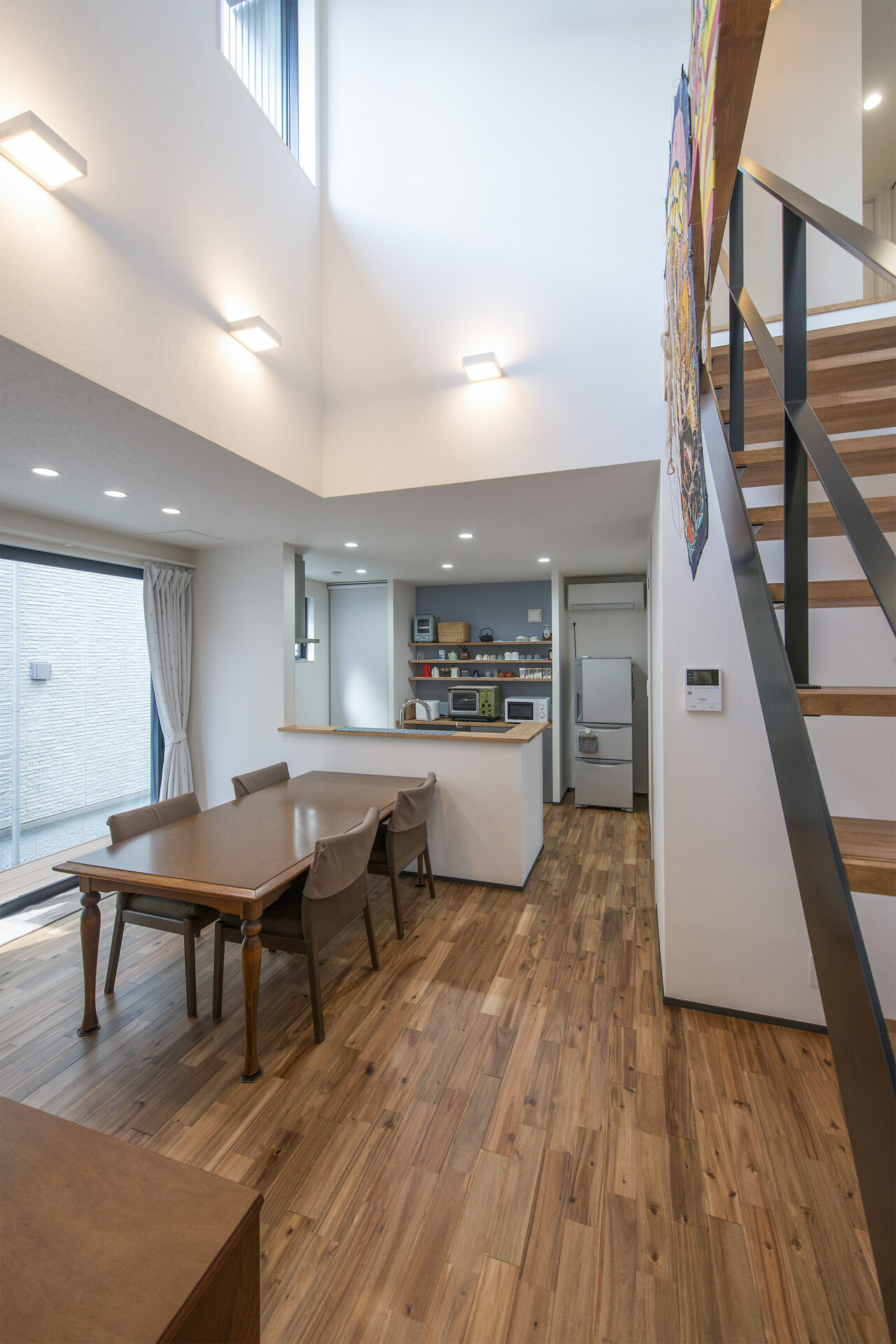 周囲を住宅で囲われたI様邸。一日の多くを過ごすダイニングが日中は影に。 そこで取り入れたのは自然のエネルギーを活用する”パッシブ設計”。 2階窓からの陽を吹き抜けから落とし、壁からの反射でダイニングを照らしました。