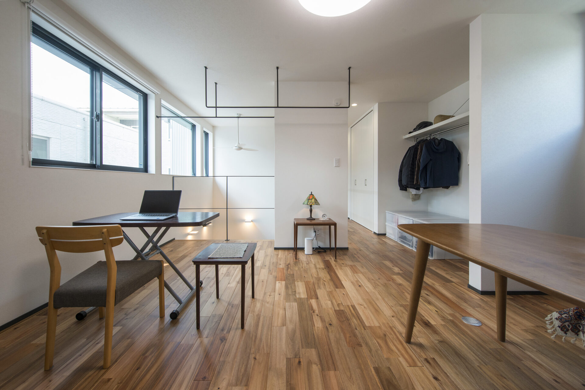 吹き抜けとつながるオープンスペース。 あえて仕切りを作らず、家族の声が届く開放的な空間に仕上げました。