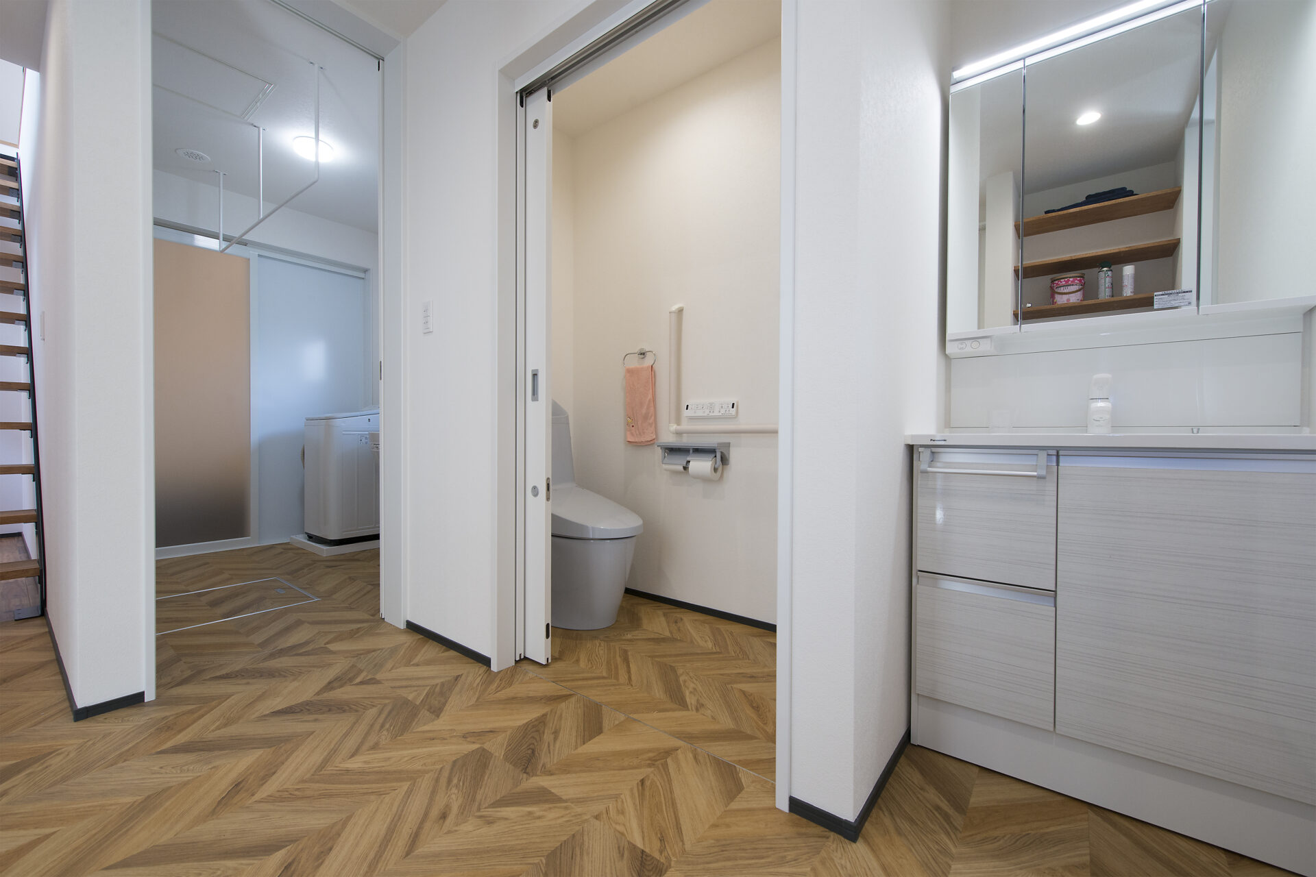 水廻りの向かい側にはピロティから繋がる動線を確保しました。現在はお父様の帰宅動線、将来はヘルパーさんの出入り口として一般住宅より広い廊下を設けました。 福祉施設の設計も手掛ける建築家ならではの将来の可能性を見据えた配慮です。