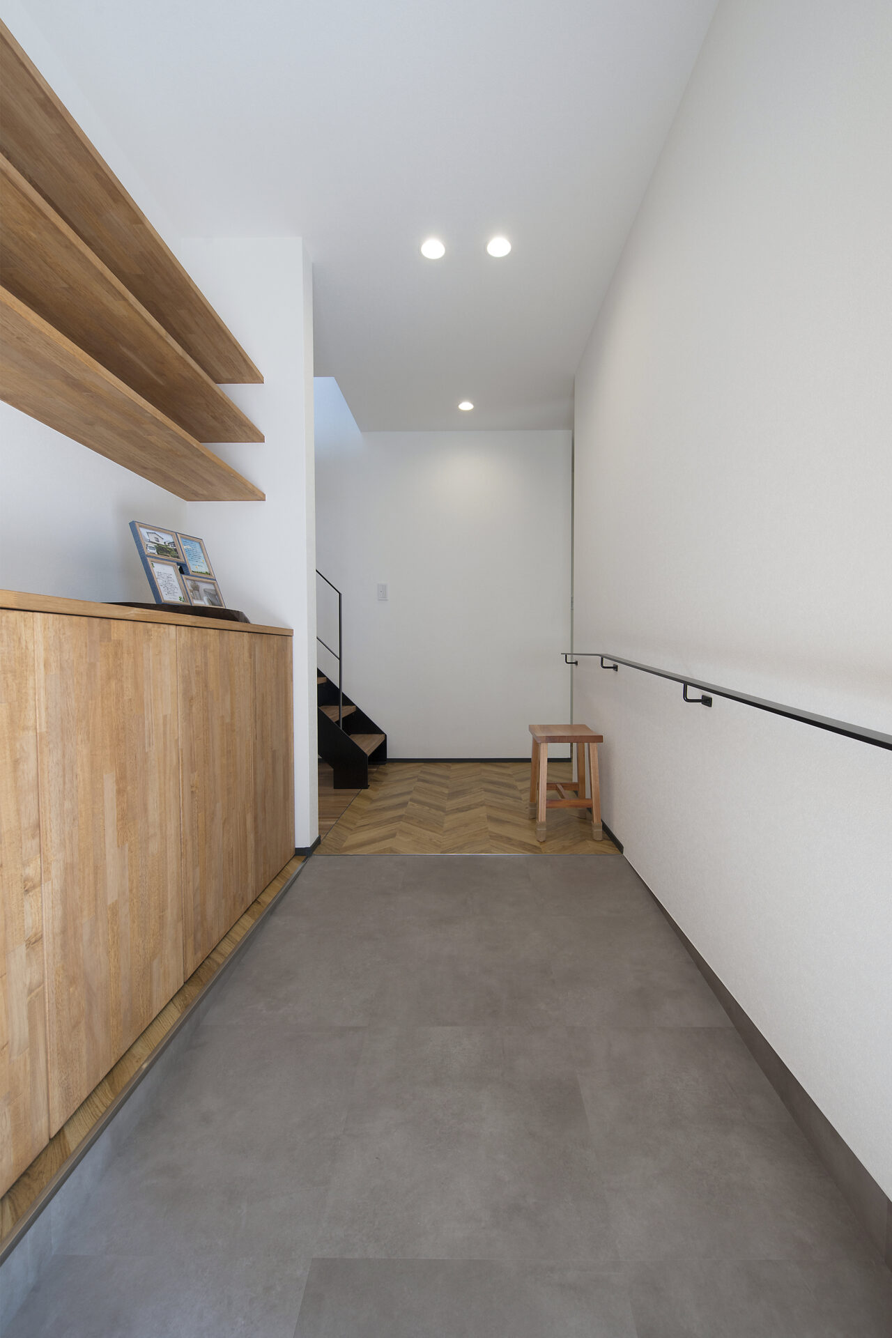 車椅子対応のスロープ。 靴箱は大工さんの造作。手摺はアイアンでスタイリッシュに。